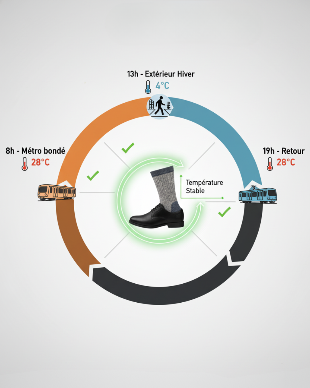 28°C dans le métro, vos pieds suent. 4°C dehors, l'humidité vous glace les orteils. Ce cycle infernal, deux fois par jour.