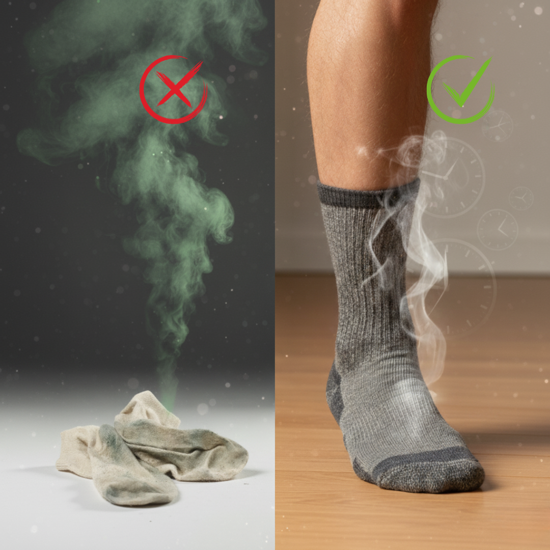 Le vrai problème ? Vos chaussettes en coton (ou synthétique) retiennent l'humidité. Elles ne respirent pas. Elles ne sèchent pas. À la fin de la journée, elles sentent.